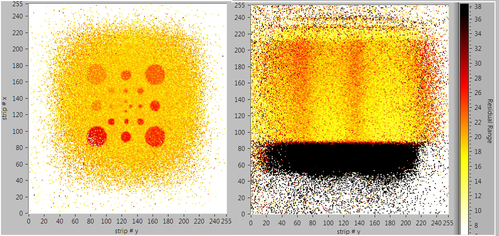 The setup is put to an experimental test, as well as simulated using Geant. A phantom consisting of a hollow aluminium cylinder is successfully imaged (figure 3). It is noted that the group of SSD plates farthest removed from the phantom provides no discernible features of the cylinder, and was therefore not used. A cross-section of the cylinder at its widest is used to obtain some more specifics of the measurement. The number of proton events per pixel varies from approximately 100 to 500, owing to the non-uniformity of the beam. Around the edges of the aluminium the reconstructed image is fuzzier than the Monte Carlo of the setup written with Geant4. This discrepancy is attributed to both a calibration accuracy of 15% in the energy conversion electronics, to multiple Coulomb scattering of the protons (although the simulation takes this into account), and divergence of the degraded proton beam. A more specialized simulation of the energy distribution of the proton beam indeed shows a larger deviation (RMS) around the interfaces between air and aluminium. The flat response of the plates farthest away is also attributed to the multiple scattering. Although both energies are found in the data, they appear nearly fully decoupled from position.