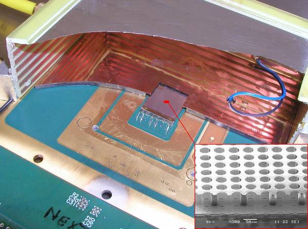 Figure 7: A GridPix cut-away view. In the center is the chip, surrounded by a drift cage, containing the drift gas. The inset shows a magnified view of the Ingrid on top of the TimePix chip. The drift cage used in our setup was smaller than what is shown here: at first 1.5cm cubed and later replaced with a 4 by 4 by 1.5