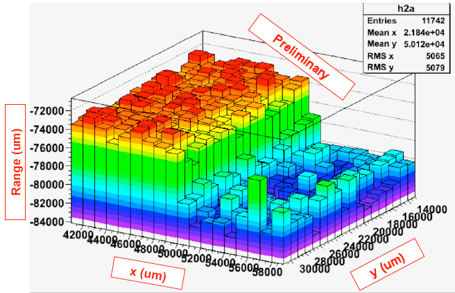 Project AQUA, an initiative that tries to advance the research on hadron therapy, makes use another kind of setup, named PRR10 (Amaldi et al., 2011). This group uses a pair of Gas Electron Multipliers to track protons and a stack of thin silicon plates to measure the range and therefore energy of the proton (figure 4). The whole device is rather compact, and the stated purpose is real-time imaging with sub mm accuracy and a range accuracy of a “few” percent, using