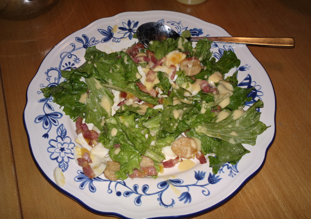 - Add bacon and add the eggs cut, and mix. The yolk should become a kind of sauce to the salad.